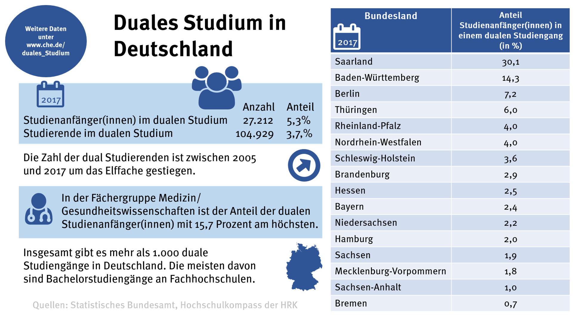 Das duale Studium in Deutschland boomt zwar, aber nicht in jedem Bundesland. Während im Saarland rund 30 Prozent und in Baden-Württemberg rund 14 Prozent der Studienanfänger(innen) in einem dualen Studiengang eingeschrieben sind, trifft dies in Sachsen-Anhalt und in Bremen nur auf rund 1 Prozent zu. Zu diesem Ergebnis kommt eine Untersuchung des CHE Centrum für Hochschulentwicklung, die erstmals die Entwicklung des dualen Studiums in allen 16 Bundesländern vertieft analysiert.