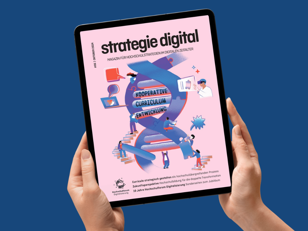 Das Magazin “strategie digital” wurde im Oktober 2021 gelauncht. Es richtet sich an die strategischen Entscheider*innen von Hochschulen und all diejenigen, die sich mit Hochschulstrategien im digitalen Zeitalter beschäftigen. Jede Ausgabe widmet sich einem Themenschwerpunkt. Die ersten vier Ausgaben haben sich den Themen “Partizipation”, “Blended University”, “(Digital) Leadership” und “Zukunftsorientierte Lernräume” gewidmet. Alle Ausgaben und weitere Informationen zum Magazin finden Sie auf der Webseite zum Magazin.