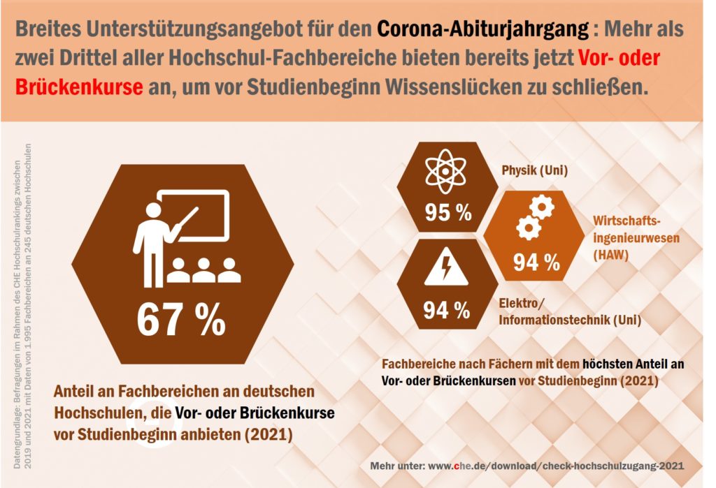 Das CHE Format CHECK zum Hochschulzugang und Studieneingang in Deutschland zeigt, dass 67 Prozent aller Fachbereiche an den Hochschulen Vor- oder Brückenkurse anbieten. In Fächern wie Physik, Informatik oder Maschinenbau, die Mathematikkenntnisse zwingend voraussetzen gibt es das Auffrischungsangebot nahezu flächendeckend.