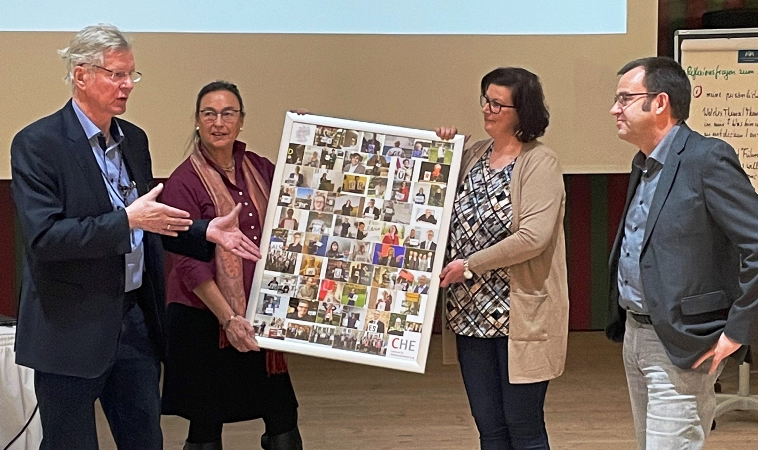 Der Erfolg dieser Mischung aus Fortbildung und Training wäre ohne ihn, der damals Vizepräsident der HRK war, nicht denkbar. Er implementierte das Programm mit dem CHE und diente den Teilnehmer*innen mit seiner klaren Vorstellung von partizipativer Führung als Vorbild. Insbesondere die Reflektion der jeweiligen Führungssituation und Führungskonstellation sowie seine Offenheit und Zugewandtheit zu Teilnehmerinnen und Teilnehmern wird allen Beteiligten lebhaft im Gedächtnis bleiben. Es war nicht nur ein Privileg, sondern auch ein Vergnügen mit ihm zusammenzuarbeiten, wie das Trainerteam Dr. Jutta Fedrowitz, Prof. Dr. Frank Ziegele (CHE) und Hubert Sonntag (Hattinger Büro) feststellte. Die Alumni des Programms steuerten Fotos für eine Collage als Abschiedsgeschenk bei.