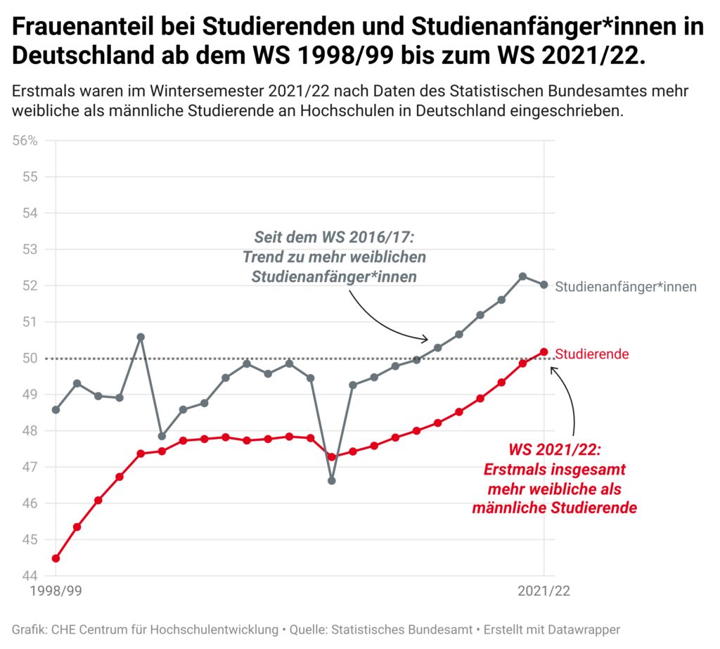 Mit einem Anteil von 50,2 Prozent gab es im vergangenen Wintersemester 2021/22 erstmals mehr weibliche als männliche Studierende an deutschen Hochschulen. Insgesamt ist der Frauenanteil im Studium in den vergangenen rund dreißig Jahren angestiegen. Im Wintersemester 1998/99 lag er noch bei 44,5 Prozent. Seit 2016 dominierten bei den Studienanfänger*innen in jedem Jahr die weiblichen Erstsemester. Auch bei den bestandenen Abschlussprüfungen stellen die Absolventinnen mit 52,9 Prozent mittlerweile die Mehrheit im Geschlechtervergleich.