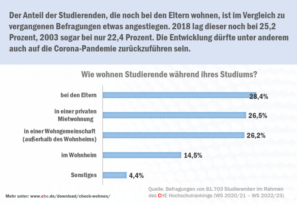 Im Rahmen des CHE Hochschulrankings beantworteten rund 80.000 Studierende Fragen zu ihrer Wohnsituation und ihrem Weg zur Hochschule. Aktuell wohnt mit 28,4 Prozent der größte Anteil bei den Eltern, rund ein Viertel lebt in einer privaten Mietwohnung bzw. Wohngemeinschaft (26,5 bzw. 26,2 %). Der Geschlechtervergleich ergibt, dass Studenten häufiger das Elternhaus noch nicht verlassen haben, Studentinnen eher eine private Mietwohnung oder WG in Anspruch nehmen.