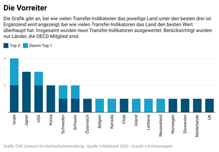 Im Rahmen der Analyse wurde aufgrund der Hochschuldaten u.a. ausgewertet, bei wie vielen der Transfer-Indikatoren ein Land unter den Top 3 ist. Führend ist hier Israel mit zwei Top-1- und zwei Top-3-Platzierungen, gefolgt von Japan und den USA. Deutschland dagegen ist bei keinem der neun Transfer-Indikatoren in den Top 3 vertreten.