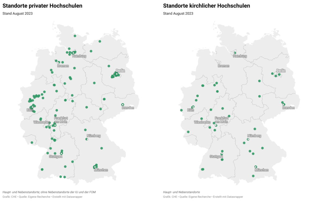 Im Vergleich zu staatlichen Hochschulen erleben nicht-staatliche und davon besonders private Hochschulen in Deutschland gerade einen Boom. Im vergangenen Wintersemester 22/23 waren 12 Prozent aller Studierenden an einer privaten Einrichtung immatrikuliert. Von den aktuell 427 Hochschulen in Deutschland befinden sich 64 Prozent in staatlicher, 27 Prozent in privater und 9 Prozent in kirchlicher Trägerschaft.