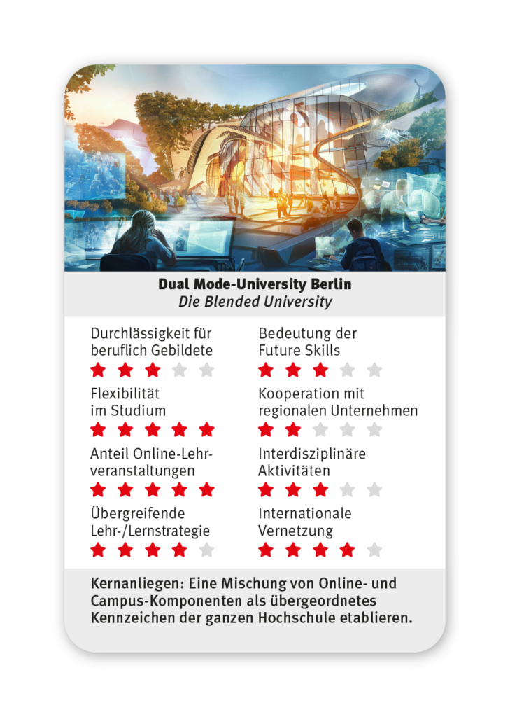 Zur Illustration entwerfen die beiden Autoren zwölf innovative Hochschulmodelle der Zukunft, die aktuelle Trends im Hochschulsystem systematisch weiterdenken. Hierzu gehört etwa die Lernkonzept-Hochschule, welche die gesamte Institution inklusive aller Mitarbeitenden auf einen prägenden Lehr-Lern-Ansatz ausrichtet. Einen anderen Ansatz verfolgt etwa das Modell einer Grand-Challenge-University, die monothematisch in einem internationalen Zusammenschluss von Forschungsuniversitäten interdisziplinär und kollaborativ eine große globale Herausforderung wie den Klimawandel bearbeitet.