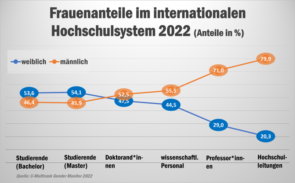 The notion of gender now also includes non-binary categories, which can also be specified in the context of the U-Multirank data collection. In the underlying data for the German and international evaluation, however, these categories could not be included due to the small number of cases; the analysis was based solely on the categories of women and men.