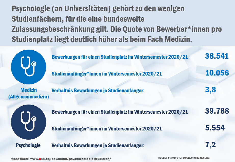 Grafik: Psychology (at universities) is one of the few disciplines that are still subject to admission restrictions nationwide. The ratio of applicants to places is significantly higher than for medicine.