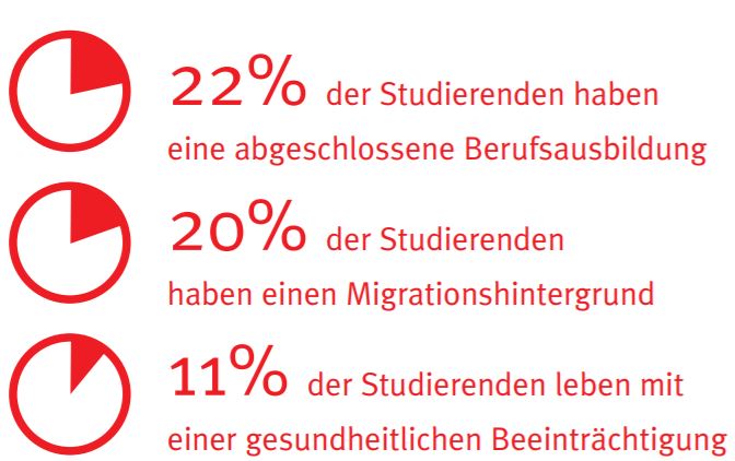 Kinderlos, Vollzeit studierend, Anfang 20, Abiturient, ohne gesundheitliche Einschränkung, aus Akademikerhaushalt, ohne Einwanderungsgeschichte – diese Beschreibung traf einmal auf die Mehrheit der Studierenden in Deutschland zu. Heute ist das Bild wesentlich bunter. Nach Angaben des Statistischen Bundesamtes hatten 2016 beispielsweise 22 Prozent der Studierenden eine abgeschlossene Berufsausbildung. 20 Prozent hatten einen Migrationshintergrund. Mit einer gesundheitlichen Beeinträchtigung leben 11 Prozent aller Studierenden. Die Heterogenität der Studierenden geht mit vielfältigen Bedürfnissen einher.